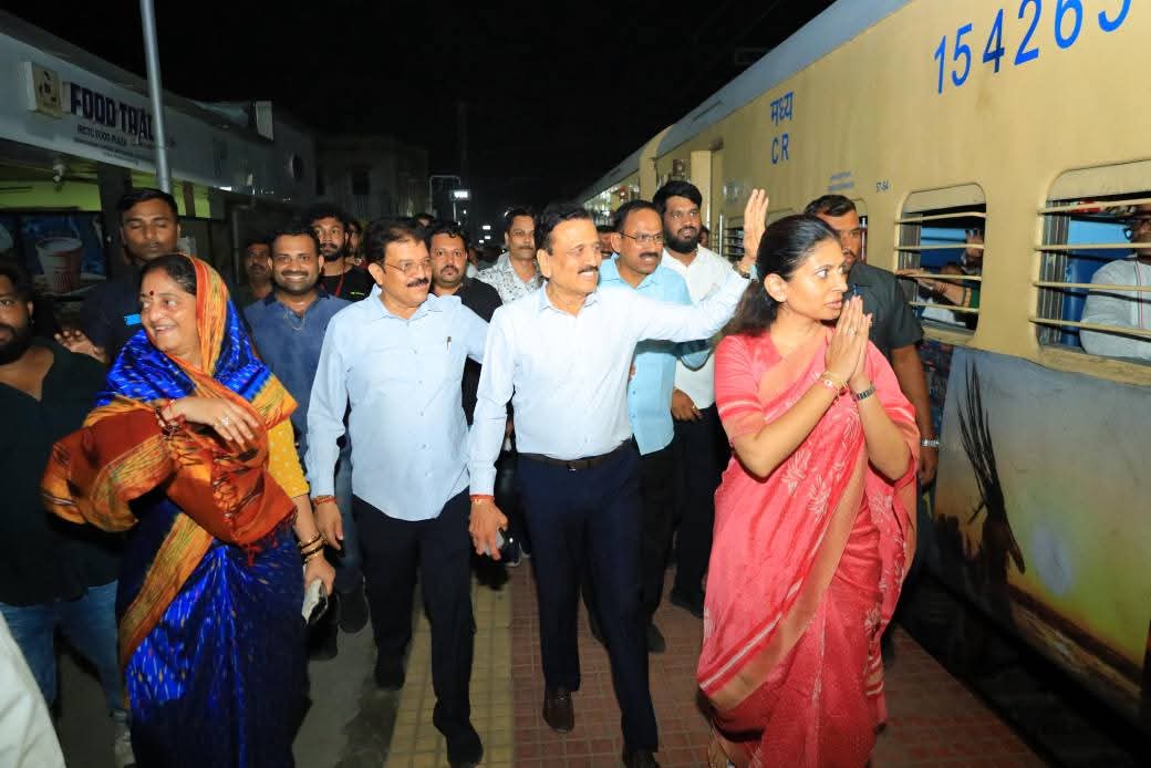जळगाव स्थानकावर सायकांळी पाच वाजता ही रेल्वे जळगाव स्थानकावर आली. यावेळी केंद्रीय मंत्री रक्षा खडसे, राज्याचे जलसंपदामंत्री गरीश महाजन, खासदार स्मिता वाघ व आमदार सुरेश भोळे यांनी या रेल्वे गाडीला हिरवी झेंडी दाखिविली. यावेळी आमदार भोळेही या यात्रेकरूसमवेत यात्रेला रवाना झाले. यावेळी नेत्यांनी गाडीतील प्रवाशांशी संवादही साधला तसेच त्यांच्यांशी आपलकीने चौकशीही केली.