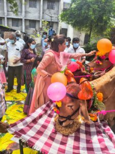 कार्यक्रमाची सुरुवात डॉ. केतकी पाटील यांच्या हस्ते बैलांच्या विधिवत पूजनाने झाली. त्यांनी बैलांना पुरणपोळीचा नैवेद्य दाखवून पूजा केली. हा पारंपरिक सण साजरा झाल्यामुळे सर्वत्र आनंदाचे आणि उत्साहाचे वातावरण दिसून आले. ग्रामीण संस्कृतीशी जोडलेले हे कार्यक्रम भावी पिढीला आपल्या परंपरांचे महत्त्व पटवून देतात.