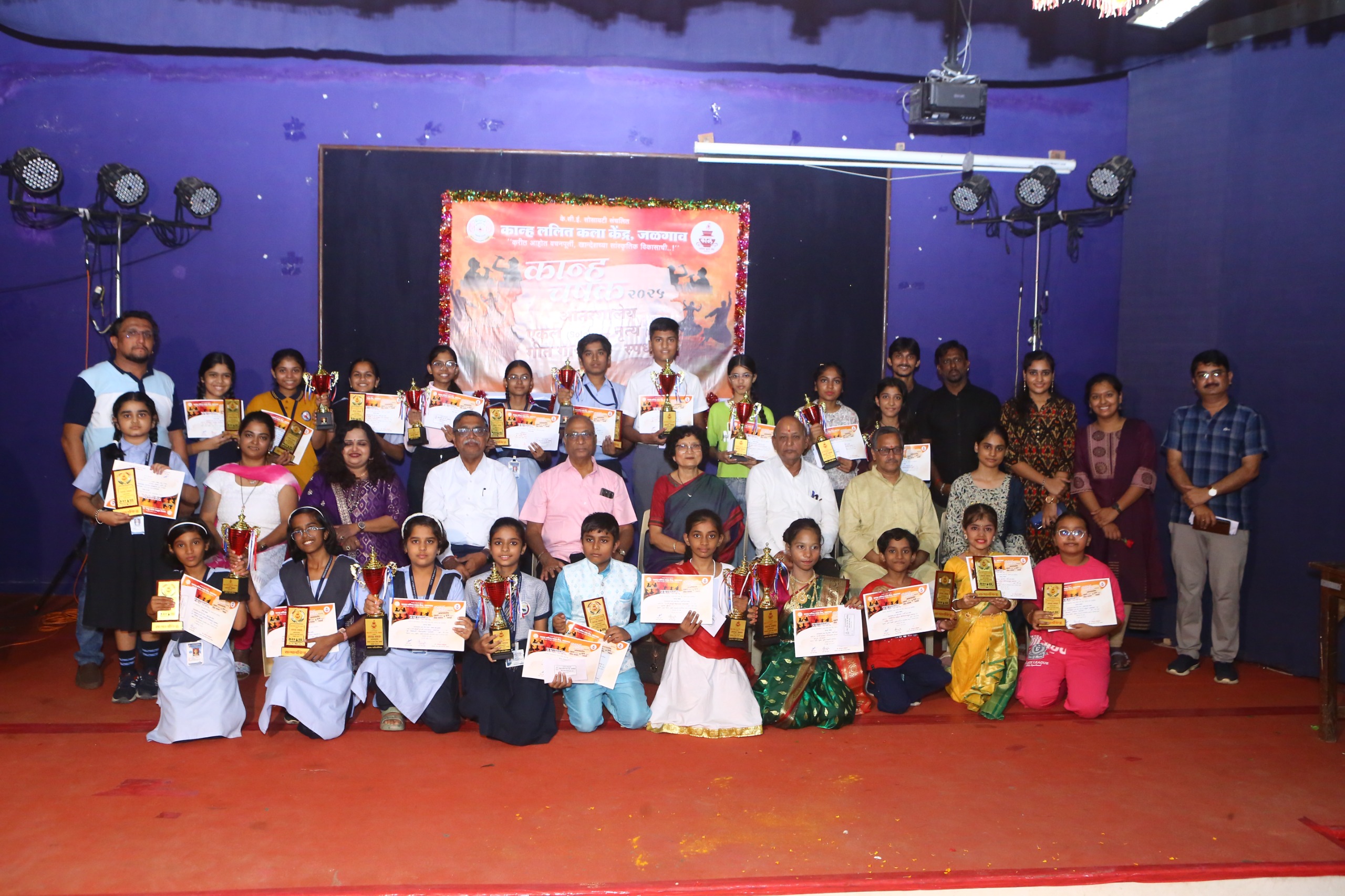 जळगाव- केसीई सोसायटी संचलित कान्ह ललित कला केंद्राद्वारे आंतर शालेय एकल गीत गायन व नृत्य स्पर्धेचे आयोजन करण्यात आले होते, यंदाचे हे तिसऱ्या वर्षाचे आयोजन करण्यात आले होते. बालगट व कुमार गटातून गायन स्पर्धेसाठी 37 विद्यार्थी तर नृत्य स्पर्धेत 36 विद्यार्थ्यांनी विविध शाळांच्या माध्यमातून आपला सहभाग नोंदवला होता. मु. जे. महाविद्यालयाच्या परिसरात दोन स्वतंत्र रंगमंचावर या स्पर्धेच्या आयोजन करण्यात आले होते.