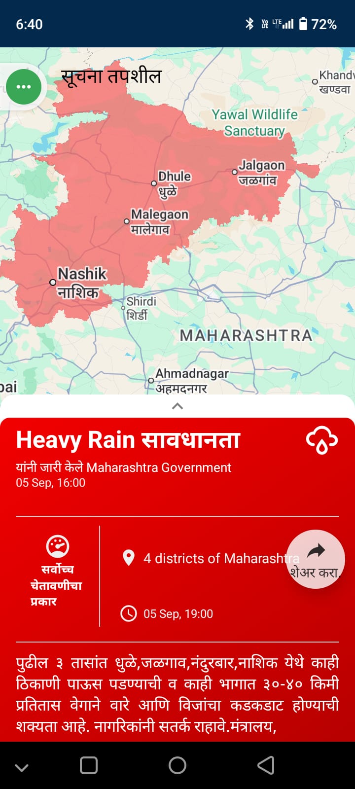 हवामान खात्याने दिलेल्या माहितीनुसार काही ठिकाणी ३० ते ४० किमी प्रतितास वेगाने वारे, विजांचा कडकडाट आणि मुसळधार पाऊस होण्याची शक्यता आहे.