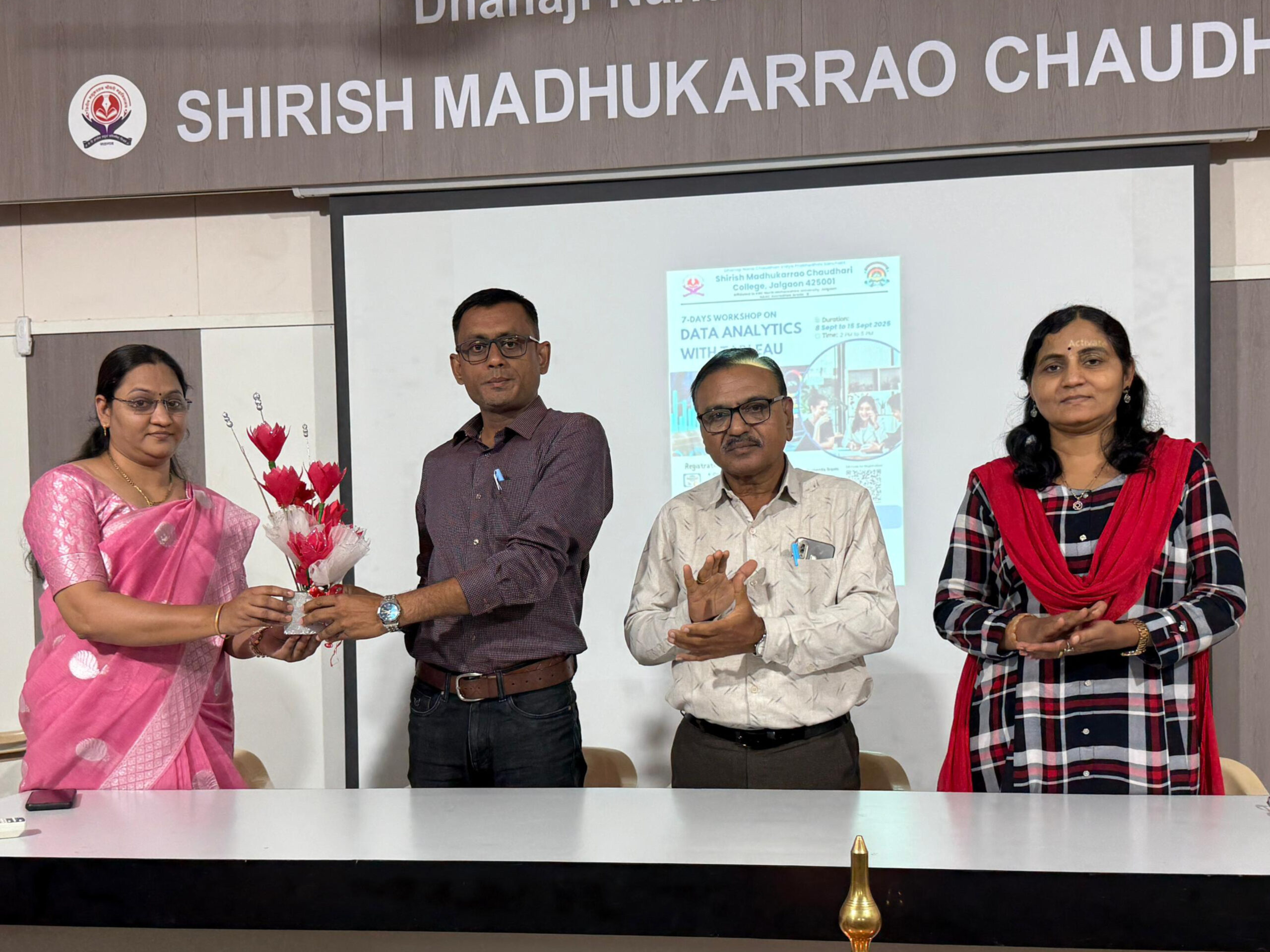जळगाव – येथील धनाजी नाना चौधरी विद्या प्रबोधिनी संचलित शिरीष मधुकऱाव चौधरी महाविद्यालयाच्या डिपार्टमेंट ऑफ कॉम्प्युटर एप्लीकेशन विभागाच्या वतीने “Tableau For Data Analytics” या विषयावर सात दिवसीय (८ सप्टेंबर ते १४ सप्टेंबर २०२५) कार्यशाळेचे आयोजन करण्यात आले. सदर कार्यशाळेचे उद्घाटन महाविद्यालयाचे प्रभारी प्राचार्य डॉ. रविंद्र लढे यांचे हस्ते करण्यात आले, याप्रसंगी महाविद्यालयाचे माजी प्रभारी प्राचार्य डॉ. पी. आर. चौधरी, तसेच संगणकशास्त्र विभागप्रमुख डॉ. प्रियंका बऱ्हाटे उपस्थित होते. सदर कार्यशाळेच्या समन्वयक दीपाली महाजन यांनी प्रास्ताविक केले व कार्यक्रमाचे सूत्रसंचालन प्रा. निकिता लोहार हिने केले. यावेळी, कार्यशाळेच्या