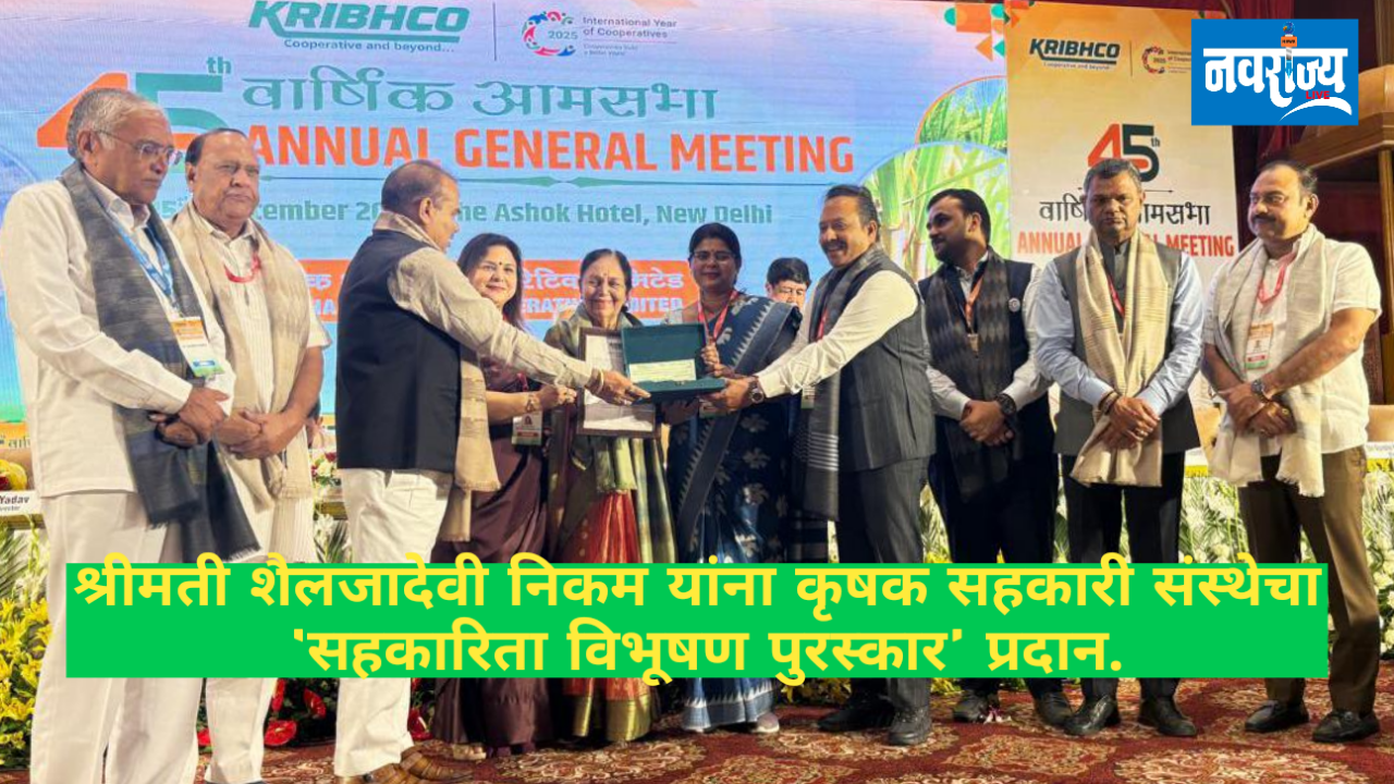मुंबई / जळगाव : महाराष्ट्रातील सहकार क्षेत्रातील उल्लेखनीय कार्याबद्दल श्रीमती शैलजादेवी डी. निकम यांना कृषक भारती को-ऑपरेटिव्ह लिमिटेड (KRIBHCO) तर्फे सन 2024-25 चा ‘सहकारिता विभूषण पुरस्कार’ जाहीर करण्यात आला. या पुरस्कारासोबत त्यांना ₹2 लाख 51 हजार इतकी रोख रक्कम देऊन गौरविण्यात आले.