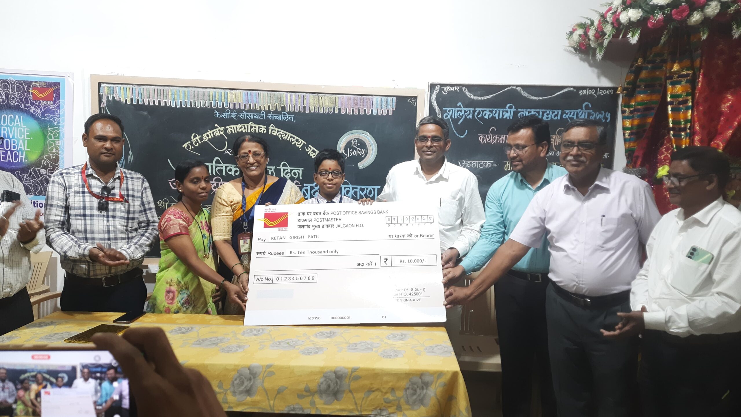 आंतरराष्ट्रीय टपाल दिनानिमित्त ए.टी. झांबरे विद्यालयात आयोजित विशेष कार्यक्रमात केतनचा टपाल विभागाच्या अधिकाऱ्यांच्या हस्ते सत्कार करण्यात आला. या प्रसंगी प्रमुख पाहुणे म्हणून मा. मोहम्मद खदीर (डाक अधीक्षक, जळगाव), मा. टी. एफ. तडवी (सहाय्यक डाक अधीक्षक मुख्यालय), एस. एस. म्हस्के (सहाय्यक डाक अधीक्षक उपविभाग), एस. एस. पाटील (विकास अधिकारी), एस. व्ही. मुंडे (विपणन अधिकारी), डॉ. अशोक राणे (प्राचार्य के.सी.ई. बी.एड. कॉलेज व संचालक, के.सी.ई. सोसायटी), तसेच प्रणिता झांबरे आणि पर्यवेक्षक नरेंद्र पालवे आदी मान्यवर उपस्थित होते.