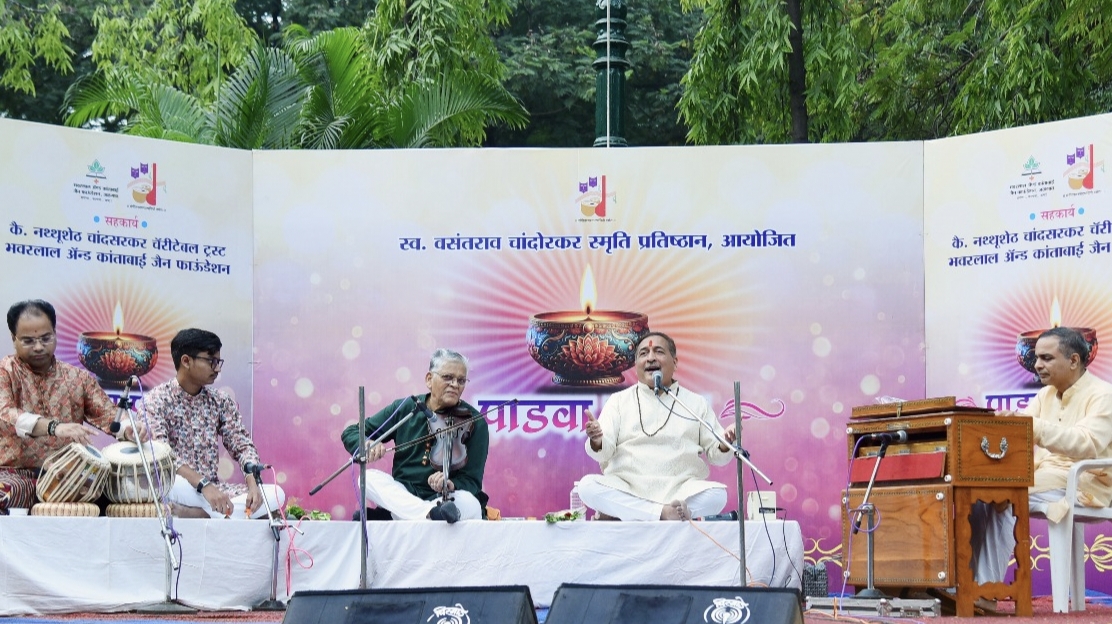जळगाव – स्व. वसंतराव चांदोरकर स्मृती प्रतिष्ठान आयोजित २४ व्या “पाडवा पहाट” या प्रातःकालीन मैफलीचे आयोजन महात्मा गांधी उद्यानात पहाटे ६ वाजता करण्यात आले होते. यामध्ये प्रख्यात राष्ट्रीय कीर्तनकार, शास्त्रीय तसेच नाट्यसंगीत गायक व नट डॉ. चारुदत्त आफळे यांच्या नाट्यसंगीत व अभंग वाणी या मैफिलीचे आयोजन करण्यात आले होते. प्रतिष्ठानच्या परंपरेनुसार गुरुवंदना जळगावचे गायक वरुण नेवे यांनी सादर केली. त्यानंतर दीप प्रज्वलन डॉ. रणजीत चव्हाण प्रतिष्ठानचे अध्यक्ष डॉ. विवेकानंद कुलकर्णी कार्यकारी विश्वस्त दीपक चांदोरकर व सचिव अरविंद देशपांडे तसेच आजच्या कार्यक्रमाचे उत्सव मूर्ती डॉ. चारुदत्त आफळे यांनी केले. कलाकारांचा सत्कार मेजर नानासाहेब वाणी, विवेकानंद कुलकर्णी अरविंद देशपांडे व शरदचंद्र छापेकर यांनी केला. कार्यक्रमाचे सूत्रसंचालन अनघा नाईक गोडबोले हिने केले. आणि सुरू झाला १८८२ सालापासूनचा संगीत नाटकातील नाट्यपदांचा प्रवास.