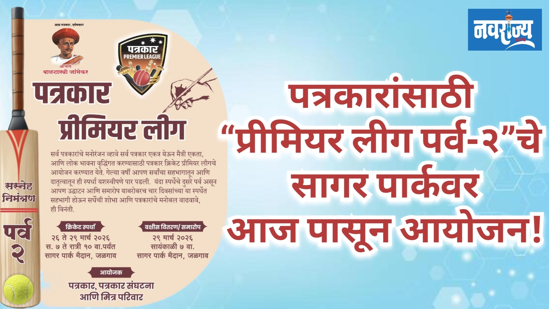जळगाव, दि.२६ : समाजाचा चौथा आधारस्तंभ मानल्या जाणाऱ्या पत्रकारांच्या मनोरंजन व कल्याणासाठी एक आगळावेगळा उपक्रम हाती घेत, “पत्रकार प्रीमियर लीग पर्व-२” चे आयोजन करण्यात आले आहे. ही स्पर्धा दि. २६ ते २९ मार्च दरम्यान सागर पार्क मैदान येथे पार पडणार असून उद्या (दि. २६) सकाळी ७ वाजता स्पर्धेचा शुभारंभ होणार आहे.