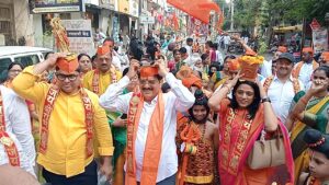 जळगाव: प्रभू श्रीरामचंद्र यांच्या जन्मोत्सवाचे औचित्य साधून सार्वजनिक श्रीराम जन्मोत्सव समिती, जळगाव महानगर तर्फे आज, गुरुवार दिनांक २६ मार्च रोजी शहरात भव्य शोभायात्रेचे आयोजन करण्यात आले होते. ‘जय श्रीराम’च्या जयघोषात आणि ढोल-ताशांच्या गजरात निघालेल्या या रॅलीने संपूर्ण जळगाव शहर राममय झाले होते. या सोहळ्यात हजारो भाविकांनी उत्स्फूर्त सहभाग नोंदवत मोठा जल्लोष केला.