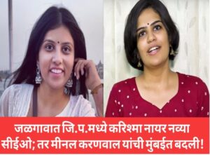 दरम्यान, नाशिक महानगरपालिकेत अतिरिक्त आयुक्त म्हणून कार्यरत असलेल्या करिश्मा नायर यांची जळगाव जिल्हा परिषदेच्या मुख्य कार्यकारी अधिकारीपदी नियुक्ती करण्यात आली आहे. नायर यांनी नाशिकमध्ये कार्य करताना शिस्तबद्ध प्रशासन आणि परिणामकारक कामकाजामुळे ओळख निर्माण केली आहे.जळगाव जिल्ह्यातील ग्रामीण विकास, शिक्षण व आरोग्य व्यवस्थेला अधिक गती देण्याचे आव्हान आता नायर यांच्यासमोर असेल.