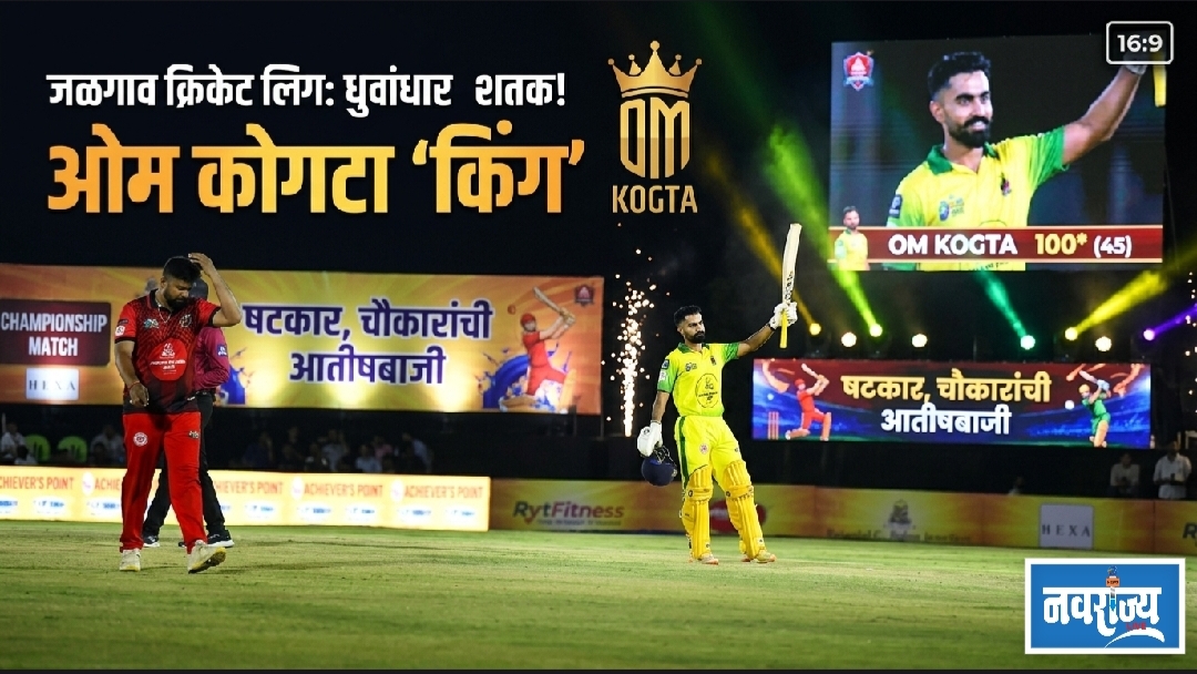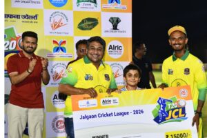 जळगाव दि. १९ प्रतिनिधी – जळगाव जिल्हा क्रिकेट असोसिएशनच्या वतीने व रतनलाल सी. बाफना ज्वेलर्स प्रायोजित व अलरीक इलेक्ट्रीकल्स सहप्रायोजकत्वाखाली आयोजित जळगाव क्रिकेट लिग-२०२६, JCL T-20 क्रिकेटमध्ये चौकार षटकारांची आतीषबाजी बघायला मिळत आहे. दुसऱ्या सामन्यात जळगाव कोगटा किंगचा ओम भोसले याने धुवांधार शतक ठोकले. चाळीसगाव एसपीसीसी चॅलेर्न्सजच्या गोलंदाजींचा समाचार घेत त्याने ५८ चेंडूमध्ये ९ चौकार व ६ षटकार लगावत १०८ धावा करुन एकतर्फी सामना फिरवला.